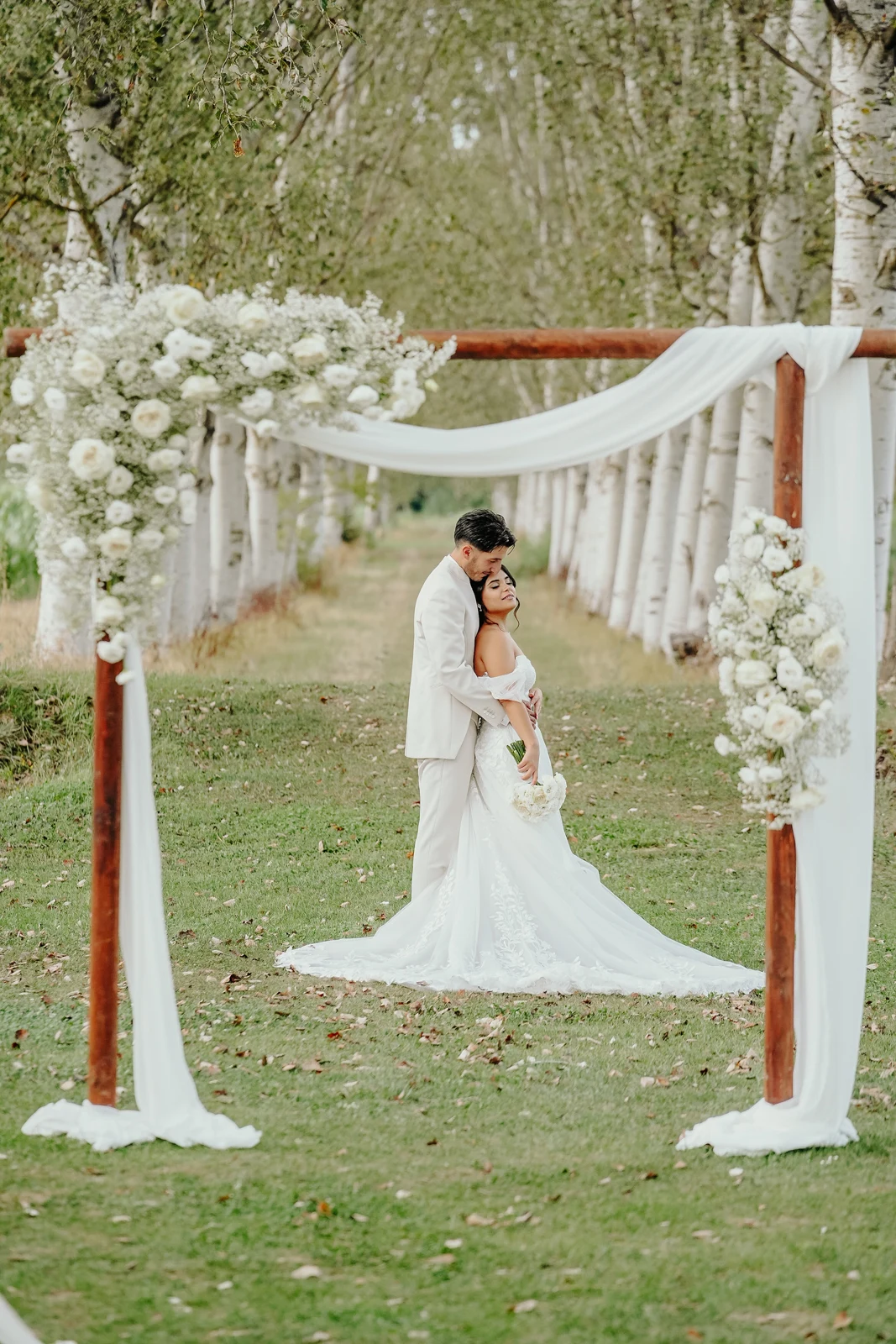 Il bianco puro delle decorazioni floreali si è fuso perfettamente con i toni caldi del legno e il verde naturale, creando un’atmosfera intima e senza tempo. Lo sguardo dolce degli sposi, catturato nel gioco di luci naturali, racconta la magia e l’intensità delle emozioni vissute.